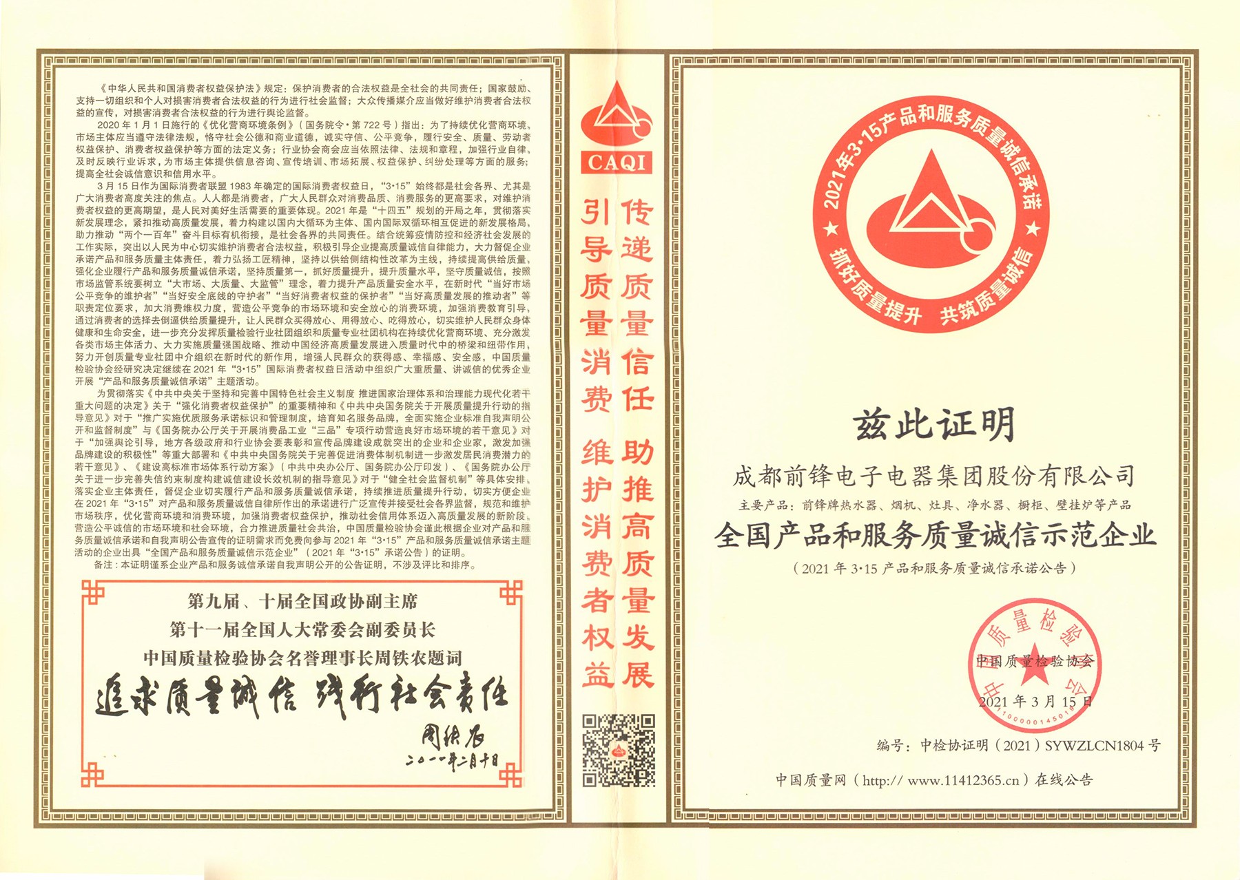 前鋒廚電榮獲“全國產品和服務質量誠信示范企業(yè)”稱號