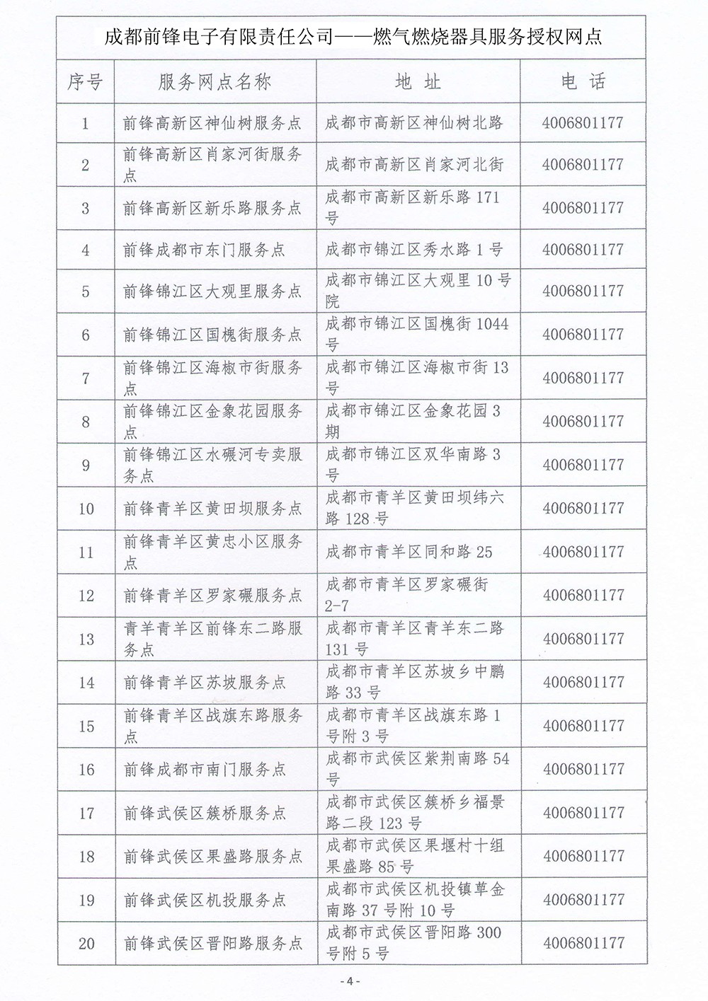 成都前鋒電子有限責任公司 燃氣燃燒器具服務授權(quán)網(wǎng)點總覽