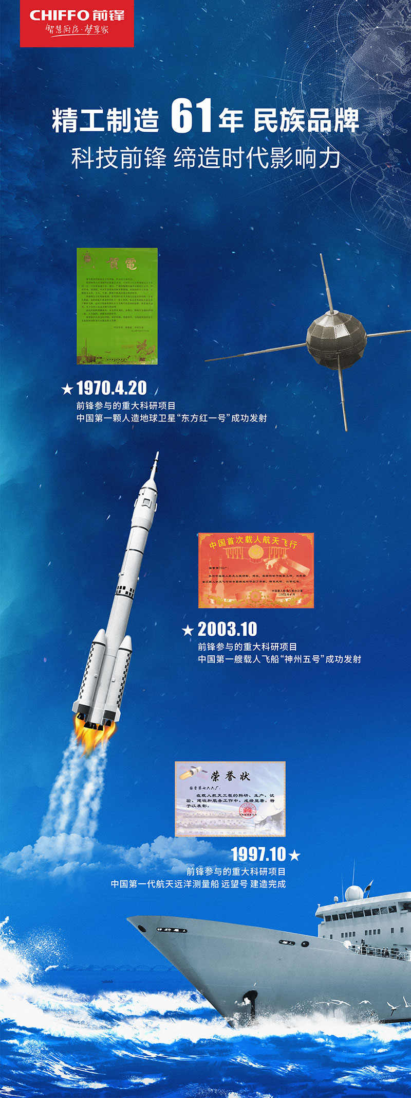 前鋒作為行業知名的技術先導型企業,擁有六十一年的發展歷程,在新中國成立之后的這70年發展進程中,緊隨國之發展,擔歷史使命,先后參與了眾多國家重大科研項目,其中包含中國第一顆人造衛星“東方紅一號”成功發射,中國第一艘載人飛船“神舟五號”成功發射,中國第一代航天遠洋測量船“遠望號”建造完成等。
